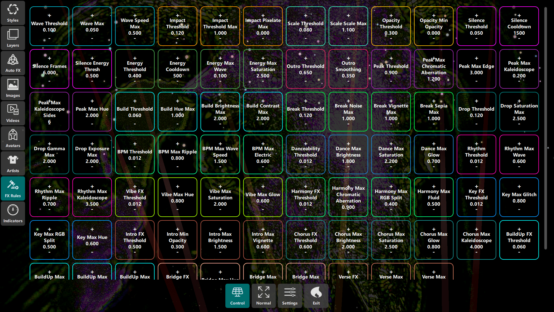 - Particle emission rates, bloom intensity, glow effects
